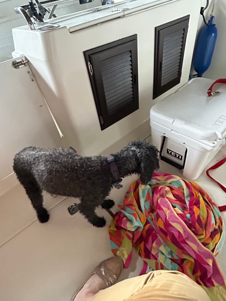Yes, three of us. This year we have Maggie with us – our 17 year old golden doodle. We left Maggie with our son’s family last summer but honestly, an old dog like Maggie seems to do best with Hugo and I. We talked with her vet wondering perhaps if it was time to put her down. He said no, feeling that Maggie still had some life left to go. We were worried about the plane trip but she managed it in good shape. And so far, touch wood, she seems to be handling the routine. She was always a good boat dog and even in her old age, she enjoys being with us. Her eyesight isn’t what it used to be and that goes for her hearing too. The very first morning, she walked off the dock into the water. She swam around for awhile before she located me and I hauled her out. A little like her owners, Maggie is still hanging in there.