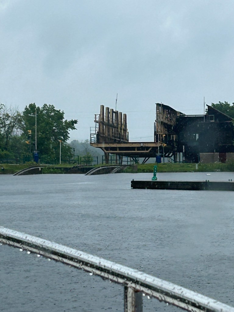 We provisioned the boat in Orillia and then started heading north on Lake Couchiching to pick up the Trent Severn Waterway to Georgian Bay. From there we followed the Severn River past the infamous CN Railway bridge where we had to dismantle the antennas and the communication mast before we were able to creep under. Spent the first night out at Couchiching Lock 42, then the second at the Waubic Restaurant near Severn Bridge. It was raining the day we went across the Big Chute Marine Railway. No boats went across with us but there was lots of staff training to run this unique style of lock. Last year, there were intermittent shutdowns due to staff shortages and it seemed Parks Canada is addressing the issue. We stopped for a night at Trent Port Marina, Port Severn to pump out, fuel up and do a laundry.