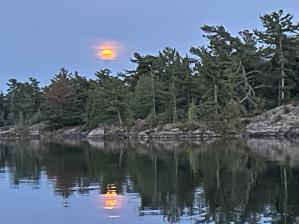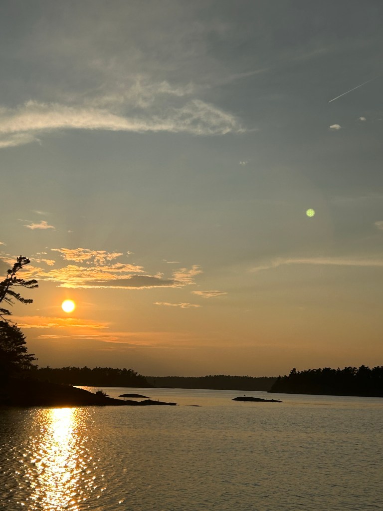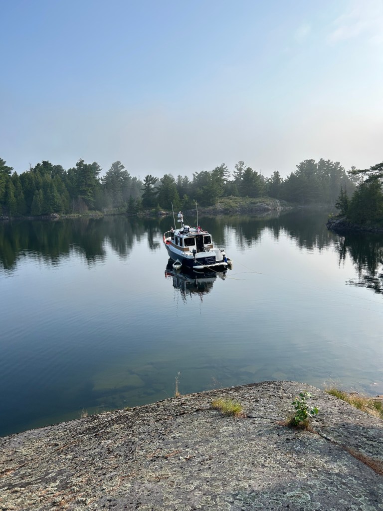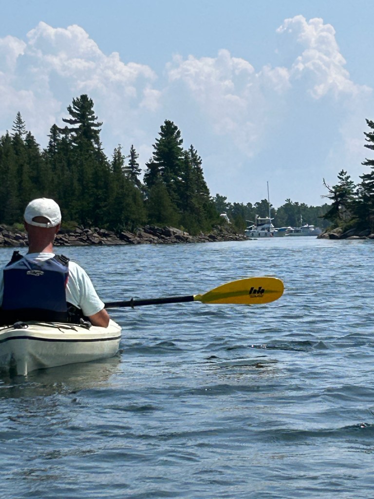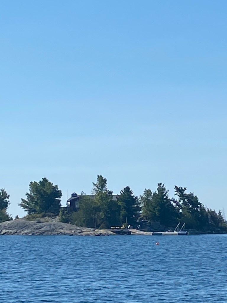 As cottagers, we used these islands for day trips. On a calm, sunny day we would pack lunch, drinks, bathing suits and towels and head directly west to the Nethermost. There was no buoyed channel so we picked our way using paper charts and landmarks like a twisted trees and knobs of rocks. The big boat (21 foot) was rarely used on such a trip, preferring to use the 13’ Boston Whaler. We would tie the boat to whatever rock was available and wade to shore. There were a few stunted trees but between the rocks, marshy plants and animals would live. Lots of frogs, snakes, birds everywhere. For a cruiser, finding a protected cove with enough mud to hold an anchor overnight can be hard, so gunk-holing is rare and our only company would be other picnickers. For the most of the outer islands, only kayakers spend the night.